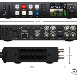 Due slot per schede SD consentono acquisizioni con un tempo di registrazione praticamente illimitato e supporta anche la registrazione su dischi USB tramite la porta USB Type-C. HyperDeck Studio HD Mini è dotato di un pulsante di controllo sul pannello frontale e di una rotella jog/shuttle per una sensazione di scrubbing analogico. Il controllo RS-422 è supportato per il controllo esterno ed è anche possibile controllare l'unità utilizzando la porta USB o tramite Ethernet a velocità 1G per un controllo del deck più rapido ed il trasferimenti di file tramite il connettore RJ45. Un LCD integrato sul pannello frontale consente di monitorare il video.
