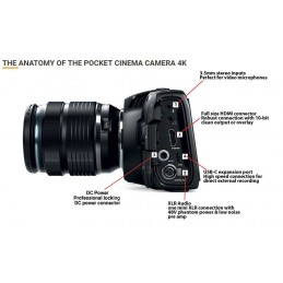 Alta qualità e prestazioni con la Blackmagic Pocket Cinema Camera 4K, progettata con sensore di dimensioni 4/3, 13 stop di gamma dinamica e doppio ISO nativo fino a 25.600 per immagini HDR e incredibili prestazioni in condizioni di scarsa luminosità. Le funzioni essenziali sono facilmente raggiungibili grazie ai controlli esterni, mentre l'ampio touchscreen da 5" permette di inquadrare le riprese, mettere a fuoco con precisione e modificare le impostazioni della fotocamera in modo pratico. Inoltre, registratori SD/UHS-II o CFast 2.0 integrati per la registrazione Blackmagic RAW o ProRes e una porta di espansione USB-C per registrare esternamente su dischi, oltre a supporto per obiettivi EF, microfoni integrati, ingresso XLR, HDMI full size, supporto 3D LUT, Bluetooth e altro ancora. Cinepresa digitale 4K per riprese a mano. Doppio ISO nativo fino a 25600 per ottime prestazioni con scarsa illuminazione. Ideale per film indipendenti, blog ed eventi. Registrazione su schede SD/UHS II/CFast 2.0 o drive USB C esterni. 4K, 13 stop di gamma dinamica, attacco micro 4/3, touchscreen 5".