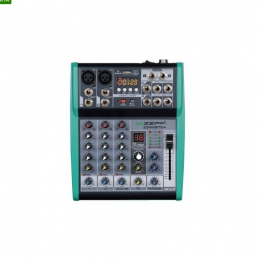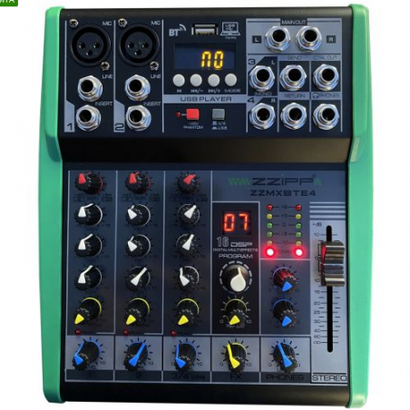 Mixer ZZIPP compatto 4 canali con lettore su USB e interfaccia PC, connettività Bluetooth e multieffetto DSP con 16 effetti. Questo mixer audio dispone di 4 input in totale e ha dimensioni ultra compatte. I due canali microfonici dispongono di alimentazione Phantom +48V, Gain per il guadagno della dinamica, un EQ a tre bande, un regolatore di effetti ed un regolatore di livello. Un canale Stereo aggiuntivo con ingresso Jack offre una connessione professionale per i vostri dispositivi esterni (iPhone, iPad, Smartphone e Tablet). Un canale è dedicato alla gestione completa della connettività Bluetooth o Pen Drive. L'interfaccia audio USB integrata permette la connessione a PC/Mac per registrazioni o riproduzioni. Il processore DSP dispone di 16 programmi con modulatore e livello personalizzabili. Struttura in metallo con alette intercambiabili di colore verde o nero, componentistica di alta qualità e il prezzo contenuto rendono questo mixer audio uno tra i migliori attualmente disponibile in commercio. Ideale per performance live, karaoke o a casa.