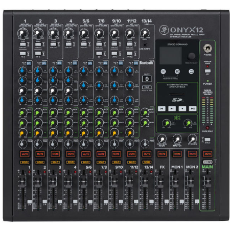 Mackie Onyx12 - mixer a 12 canali; 8 ingressi microfono con 100Hz Low-cut e alimentazione phantom 48V; guadagno fino a 60 dB; EQ a 3 bande; con medi parametrici sui canali 1-4; ingressi Hi-Z per chitarra, basso e altri strumenti; registrazione multitraccia 24 bit/ 96 kHz (14 tracce via USB su MAC/PC); registrazione stereo su scheda SD; registrazione One-touch possibile; ritorno USB assegnabile; riproduzione via SD possibile; 1x ingresso mini jack; streaming Bluetooth; fino a 6 preset utente memorizzabili; processore di effetti integrato con parametri regolabili e un proprio EQ; misuratore di livello a LED; uscita sala di controllo separata; uscita monitor; 6. 3 mm uscita cuffie; PFL/AFL solo; pulsante mute per canale; display a colori; incl. Pro Tools First con The Musician Collection PlugIn Bundle, Waveform OEM con DAW Essentials Bundle
