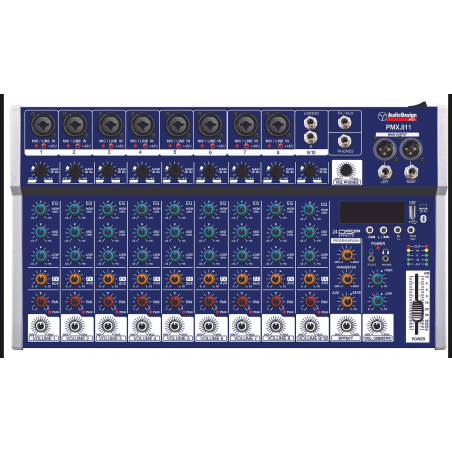 PMX.811- 8 Ingressi Mono Mic (XLR) / LINE IN (Jack bilanciato) - 1 Ingresso Line Stereo (Jack sbilanciato) - 1 Ingresso USB/BT o collegamento PC / MAC (funzione Sound Card In-Out) - EQ +/- 15 dB (Alti 15 KHz - Medi 2,5 KHz - Bassi 80 Hz) su tutti gli ingressi - Indicatore di picco sugli ingressi Mono e Stereo - Regolazione del livello effetti sui canali Mic e Line - Regolazione del livello effetti sul Main - Multi effetto DSP 24 effetti incluso 4 tipi di Reverbero