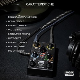 Gli amplificatori e processori di effetti ultraportatili POD® Express Guitar consentono a chitarristi e bassisti di portare i loro toni ovunque vogliano. I controlli semplici li rendono facili da usare, mentre i modelli derivati dalla pluripremiata famiglia di processori HX® garantiscono una qualità sonora eccezionale e un feeling autentico. POD Express Guitar include sette amplificatori, sette cabinet e 17 effetti, tra cui un looper, ed entrambe le unità possono essere alimentate da tre batterie AA (incluse) o da un alimentatore opzionale da 9 volt. Le caratteristiche aggiuntive includono uscite stereo, tap tempo, un accordatore, un noise gate, un'uscita per cuffie e un'interfaccia audio USB-C con funzionalità di re-amping. È possibile aggiungere un pedale di espressione opzionale per il controllo del volume o fino a due interruttori a pedale per selezionare le preselezioni o attivare e disattivare gli effetti.