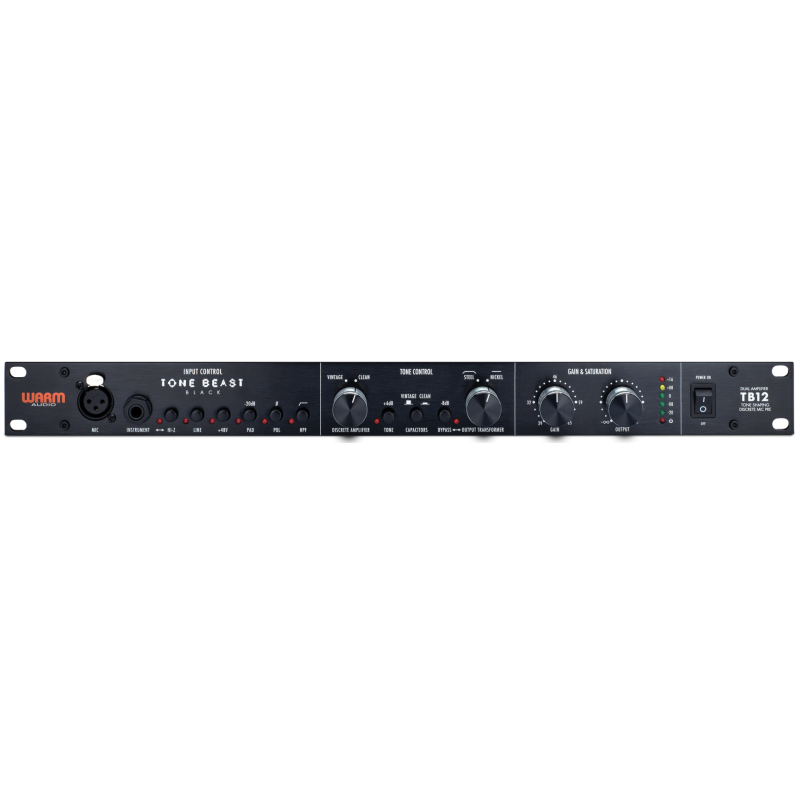 Warm Audio Tone Beast TB12 è uno dei migliori preamplificatori microfonici presenti sul mercato nella sua fascia di prezzo.Utilizza componenti di qualità costruiti in USA, normalmente presenti in macchine decisamente più costose. In aggiunta alle doti di qualità e convenienza impareggiabili, il Tone Beast eccelle in flessibilità grazie a caratteristiche uniche in grado di plasmare il suono, come se si avessero a disposizione più preamplificatori con circuiterie differenti. Professionisti e musicisti apprezzeranno la potenza e duttilità del Tone Beast, capace di scaldare e modellare il suono sia durante la ripresa che durante il mixing. Lo stadio d’ingresso può accogliere qualunque tipo di sorgente, di linea o microfonica.Grazie allo switch denominato TONE l’impedenza viene variata da 600 ohm a 150 ohm: questo comporta un aumento di +6dB portando il gain massimo da +65dB a +71dB.Ciò, oltre a rendere l’unità complemento perfetto per i microfoni a nastro, permette di cambiare decisamente pasta sonora a microfoni o strumenti collegati.Il TONE control influenza tutti gli ingressi (MIC, LINE e Hi-Z). L’impedenza di 600 ohm è consigliata per microfoni a condensatore e dinamici mentre impostandola a 150 ohm (pulsante TONE premuto) riusciremo a pilotare senza problemi anche i ribbon più difficili da amplificare.L’etichetta TONE è dovuta al fatto che anche la risposta in frequenza viene modificata, per cui si consglia di provare il Tone Beast con il pulsante in entrambe le posizioni e verificare quale soluzione risulta di maggior gradimento, a prescindere dalla sorgente!Switch x731 / x18: due amplificatori operazionali discreti completamente differenti possono essere selezionati: uno basato sullo stile del classico OP AMP 1731, caratterizzato da sonorità vintage, l’altro sulla base del 918, più moderno e trasparente. Entrambi i componenti sono montati su piedinatura standard a 6 contatti, il che permette all’utente di usare altri OP AMP di sua scelta.CAPACITORS SWITCHDue differenti condensatori possono essere selezionati, un’altra freccia all’arco del TONE BEAST!STEEL e NICKEL ovvero un condensatore al TANTALIO (vintage sound) e uno ELETTROLITICO decisamente “clean”.OUTPUT Trasformer SwitchIl trasformatore in uscita può venire totalmente bypassato, per avere ANCHE un preamp trasparente senza trasformatori (l’uscita viene attenuata di 8dB).OUTPUT Trasformer Selector SwitchQuesto switch permette di scegliere tra due differenti trasformatori in uscita CINEMAG.Lo “Steel Core” ha un sapore decisamente Vintage con una leggera enfasi sulle medie; il “50% Nickel Core”, progettato da CineMag appositamente per il Tone Beast, possiede caratteristiche sonore più “Clean”. La versione in nickel è sottoposta ad un processo di lavorazione particolare che, pur mantenendo un risposta molto lineare, mantiene un’impronta sonora molto morbida, impossibile non innamorarsi del suo suono!!! SPECIFICHE TECNICHE: • 71db di gain • La sezione transformer offre trasformatori in uscita cinemag sia acciaio e 50% nickel per variarne il carattere • Selettore di transformer bypass per rimuovere il trasformatore in uscita dal circuito • Selezione discrete opamp selection per scegliere tra stile opamp 1731(vintage) e 918(cleaner). Questi sono su socket e rimpiazzabili con opamps serie 2520 6 pin di tuo gradimento • Selettore impedance per passare a una imoedenza di ingresso tra 150 e 600 ohms • Ingresso hi-z 2 meg ohm ''true input'' sul pannello frontale invia il segnale dello strumento attraverso l'intero circuito, inclusi sia i trasformatori cinemag e gli opamps discreti. Ottimo per chitarre, bassi, tastiere e altri strumenti con uscita su jack da 1/4″ • Hipass filter 80hz • Inversione di polarità • Utilizza trasformatori cinemag premium grade • +48v phantom power • Attenuazione di uscita per flessibilità nella saturazione sia di opamps che trasformatori • Insert da ¼" per usare inline compressors, eq etc • Ingressi mic bilanciati xlr (anteriore e posteriore), trs di linea bilanciato e instrument da ¼" sbilanciato • Uscite XLR bilanciate e trs • Pad -20db • Vu meter a LED • Montabile a rack 19" • Alimentazione interna selezionabile tra 115/230 • Selezione di condensatore tra tantalum e electrolytic per cambiare il carattere