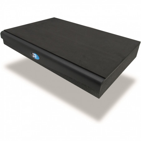 Per assicurarsi che la cassa non si sposti, viene applicata anche una superficie superiore anti scivolo in neoprene. Questa, insieme alla spugna isolante, chiude a sandwich la piastra stabilizzante in modo che non risuoni. Questo effetto viene rinforzato anche da un pannello frontale curvato per aumentare la massa, ed