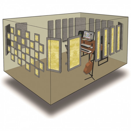 Kit per una stanza di 14 m. quadrati. Comprende 12 pannelli mod. Control Columns da cm.30,48x121,92x5,08 con 48 clips; 6 pannelli Broadband da cm.61,00x121,92x5,08 con 16 clips; 24 Scatter Block da cm.30,48x30,48x2,54 con 24 clips. Colore Beige.