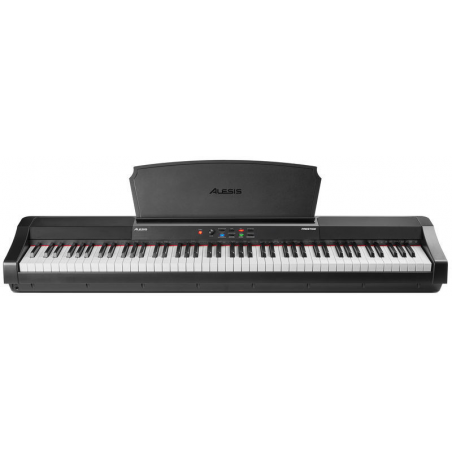 Alesis Prestige; pianoforte digitale; 88 tasti full-size con azione graduata del martello e velocità regolabile; 16 voci integrate con funzione split e layer; polifonia massima: 128 note; 50W (2 x 25W) sistema di altoparlanti micro-array; 5 effetti di riverbero regolabili; con modalità di apprendimento e registrazione; 10 canzoni demo per pianoforte; metronomo integrato, regolabile da 30 - 280BPM; connessioni: 2 uscite di linea (6.3mm jack), 2 uscite per cuffie con funzione mute (6.3mm e 3.5mm jack), 1 ingresso pedale sustain (6. 3mm jack), 1x connettore a 3 pedali (5-pin DIN), 1x porta USB tipo-B, 1x connettore di alimentazione; uscita MIDI USB per l'uso con software o strumenti virtuali; alimentato da alimentatore incluso (12V DC / 3A); incluso leggio, scheda di download del software, pedale sustain, alimentatore e manuale utente; Dimensioni (L x P x A): 132,2 x 29,7 x 14,9cm; Peso: 12,8kg