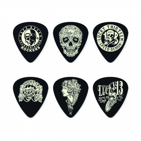 Player's Pack da 6 plettri, tutti calibro 1.0mm con diverse illustrazioni: Cafe Racer, Deadwood, Speed Demon, Helmet Skull, Voodoo Queen, Vintage Speed.