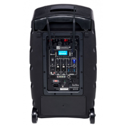 For wired devices, the Roadbuddy has two channels with combo jacks and individual volume controllers that are switchable for microphone and line level, a stereo input via RCA (Cinch) sockets (mono summed) and a 3.5 mm Aux input. Treble, Bass, Echo and Master volume controllers complete the control panel.