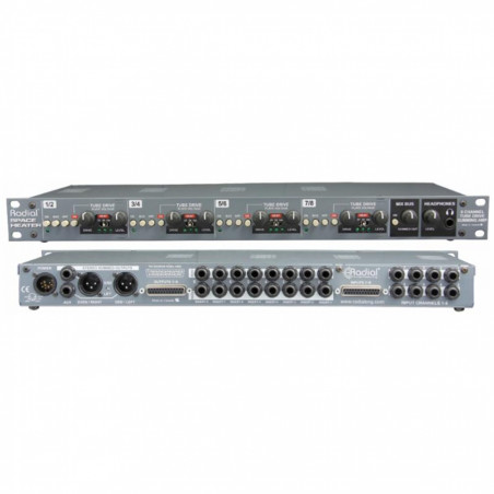 Progettato come box di carattere, il Radial Space Heater racchiude otto canali a valvole in uno spazio compatto da 19 con drive e uscita individuale per ciascun canale. L'interruttore a 3 posizioni 'HEAT' permette all'utente di passare da 35, 70 o 140 volt per regolare con un tocco la distorsione o andare sopra le righe con una piena saturazione. Ciascun canale può essere utilizzato singolarmente o tutti gli otto canali possono essere mixati in un bus stereo (utile, per esempio, per ingrossare il suono di un kit di batteria). Un amplificatore per cuffie integrato è disponibile per il monitoraggio o la risoluzione dei problemi. Connessioni da e per lo Space Heater sono supportate con prese bilanciate TRS da ¼" e D-sub a 25 poli con XLR nell'uscita principale.