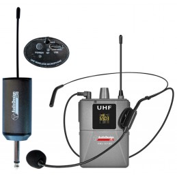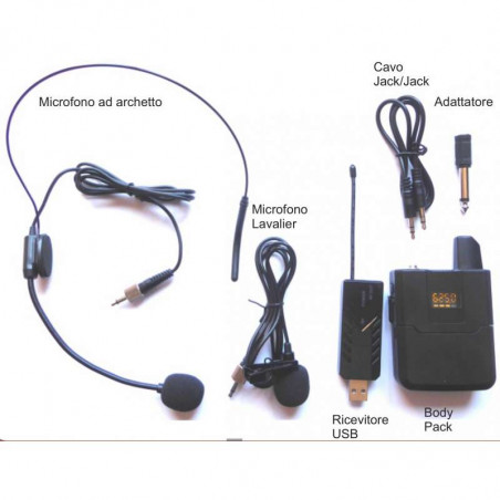 Il prodotto si compone di un ricevitore USB e di un trasmettitore a Body Pack e, per garantire la massima flessibilita` di utilizzo, e` fornito di due microfoni (da usare in alternativa), uno ad archetto e l’altro tipo Lavalier.