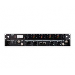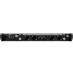 Ricevitore digitale a 4 canali per serie ULX-D. Fino a 72 sistemi per banda, ricerca automatica dei canali disponibili e sincronizzazione del trasmettitore tramite IR. Display LCD per visualizzare lo stato del dispositivo e i parametri di configurazione. LED con indicazioni del livello di segnale RF e Audio. Pulsanti per impostazione del guadagno del sistema (range 60 dB). Uscita audio bilanciata XLR3 livello impostabile mic/line. Doppia porta di rete per controllo da remoto e interfaccia audio networking Dante. Possibilità di configurazione “Audio Summing” e “body-pack Frequency Diversity”. Uscite RF per il collegamento di altri ricevitori. Alimentazione antenna 12-13 Vdc, max 150 mA. Alimentazione: 100-240 Vac, 0,26 A max. Dimensioni: 44 mm x 482 mm x 274 mm, 1 unità rack. Peso: 3,45 Kg.