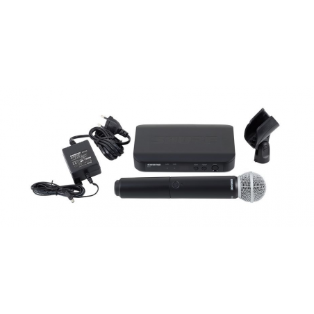 Il set include: Ricevitore radio BLX4E, trasmettitore manuale BLX2 con capsula microfonica SM58, morsetto per microfono