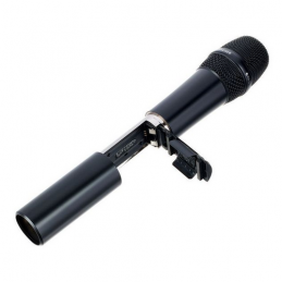 Con microfono lavalier a condensatore ME 2-II (schema polare: omnidirezionale), trasmettitore portatile SKM-S con interruttore mute e capsula dinamica intercambiabile MMD 835 (schema polare: cardioide)