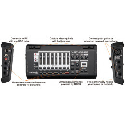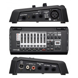 V-STUDIO 20 unisce effetti per chitarra BOSS con la tecnologia di modeling COSM Roland in un' unica unità hardware e con un software di registrazione integrato, garantendo grande portatilità, versatilità e la qualità di registrazioni su computer. Sia che siate a casa o in altre situazioni, potrete collegare una chitarra o un microfono e disporre di suoni BOSS di qualità e successivamente registrare direttamente su computer le vostre performance. Grazie al software Cakewalk Guitar Tracks sarete in grado di editare e mixare il vostro lavoro. Non cercate imitazioni, Roland, Cakewalk, e BOSS sono marchi che garantiscono la miglior soluzione per la registrazione.5 semplici passi per registrare chitarra e voce1. Collegate la chitarra o il microfono al VS-202. Selezionate il suono che più vi piace usando gli effetti BOSS3. Scegliete le vostre backing tracks, premete record e suonate le vostre parti4. Usate VS-20 come superficie di controllo per i vostri mix5. Finalizzate le vostre canzoni per creare un CD o un MP3 Caratteristiche tecniche * Registrazioni di alta qualità con un'interfaccia audio stereo * Compatto, portatile e alimentato via USB - ideale per la registrazione mobile * Controllate i vostri mix con fader, tasti e manopole * Grandi suoni con zero latenza, COSM hardware e effetti DSP con cotrollo via software * Semplicità di utilizzo - perfetta integrazione hardware e software * Connessione per monitor, cuffie, pedali e footswich Caratteristiche tecniche * Hardware (VS-20) * Audio Interface * Number of Input Channels 2 * AD/DA Conversion Sample Rate: 44.1 kHz * Signal Processing: maximum 24-bit (depending on software) * Frequency Response 20 Hz to 20 kHz (+0/-3 dB) * Residual Noise Level -90 dBu or less * (INPUT: GUITAR/BASS, 47 k ohm terminated, INPUT SENS knob = center, DIRECT MONITOR knob = center, OUTPUT LEVEL knob = center, IHF-A, Typical, Effect = OFF) * Nominal Input Level GUITAR/BASS: -10 dBu, MIC 2: -40 dBu, LINE: -10 dBu * Nominal Output Level OUTPUT: -10 dBu * Input Impedance GUITAR/BASS: 1 M ohm, MIC 2: 4 k ohms, LINE: 10 k ohms * Output Impedance OUTPUT: 2 k ohms, PHONES: 44 ohms * Recommended Load Impedance OUTPUT: 20 k ohms or greater, PHONES: 32 to 100 ohms * Connectors GUITAR/BASS: 1/4 inch phone type, MIC 2: XLR type (balanced/phantom power +48 V), LINE: 1/4 inch phone type, OUTPUT: RCA pin type, PHONES: Stereo 1/4 inch phone type, REC, PLAY (FOOT SW): TRS 1/4 inch phone type, EXP PEDAL: TRS 1/4 inch phone type, USB: B type * Others * Power Supply USB Bus Power * Current Draw 320 mA * Phantom Power +48 V/10 mA * Accessories V-STUDIO 20 DVD-ROM(for Windows' * Cakewalk Guitar Tracks 4 (Recording Software), V-STUDIO 20 Software Effects Editor, V-STUDIO 20 USB Drivers, Owner's Manual (PDF) in French, German, Spanish, Italian, Portuguese, Dutch Owner's Manual in English, USB Cable, Cakewalk Service Information Sheet * Options Foot Switch: BOSS FS-5U, Dual Foot Switch: BOSS FS-6, Expression Pedal: Roland EV-5 BOSS FV-500L, FV-500H * System Requirements * Operating System Windows XP (32-bit), Windows Vista (32-bit), Windows 7 (32-bit) * *This product does not support Windows XP Media Center Edition or XP Professional x64. * *When running Vista x64 or Windows 7 x64, Guitar Tracks runs in the 32-bit emulation layer. * *Macintosh computers running Microsoft Windows are not officially supported. * OS requirements on Netbook computers: TBA * Processor Intel® Pentium® 4 1.3 GHz or AMD Athlon™ XP 1500+ or higher * (Netbook: Intel® Atom® or AMD Athlon Neo™ Processor) * RAM 512 MB (1 GB or more recommended) * (Netbook: 1 GB) * Hard Disk Space 100 MB for core program (6 GB recommended) * Video Resolution 1024 x 600, 16-bit color screen resolution * USB Port Required * Optical Drive DVD-ROM drive for installation * *Software also available via download for Netbook users without DVD drives * Additional Information: An internet connection is required for viewing online video tutorials and for uploading music. Cakewalk Publisher requires you to have available web server space with FTP access privileges. QuickTime support requires QuickTime 7 or higher. * Size and Weight ( Hardware ) * Width 299 mm 11-13/16 inches * Depth 144 mm 5-11/16 inches * Height 53 mm 2-1/8 inches * Weight 760 g 1 lbs. 11 oz.