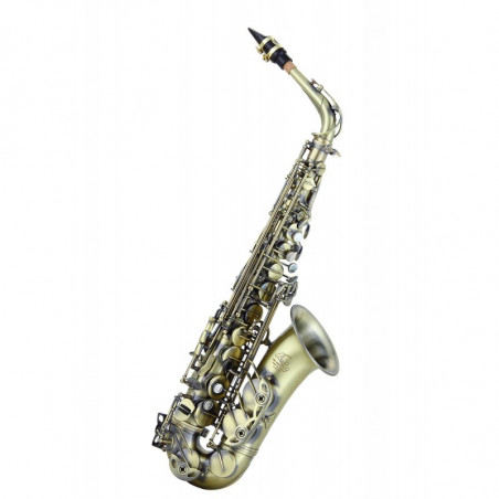 Sax Contralto Lien Cheng A-701 GF finitura Vintage Dark Antique. Realizzato interamente in ottone 65:35, molle in acciaio blue realizzate in Germania e cuscinetti in pelle made in italy.