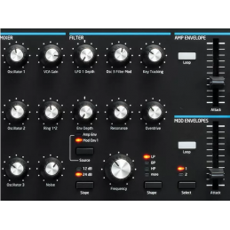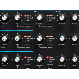 3 oscillatori NCO New Oxford per voce consentono la generazione di suoni sottrattivi, wavetable o FM