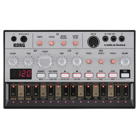 Il Korg Volca Bass è un sequencer analogico per basso di ispirazione Electribe, proposto in un formato compatto. Traendo ispirazione dal Korg Monotron e dalla gamma Monotribe, il Volca Bass si occupa della basse frequenze della nuova serie Korg Volca. Dotato di tre oscillatori, un generatore di inviluppo, un filtro di nuova concezione, un VCA e un LFO, il Volca Bass utilizza un'architettura semplice, con una miriade di opzioni per la creazione di un singolo suono. Il Volca Bass può anche essere collegato e controllato da una DAW via MIDI. I tre oscillatori analogici possono essere utilizzati all'unisono per generare ricchi suoni modulati, o regolati per fare accordi a 3 voci, ciascuna sequenziabile in modo indipendente per creare frasi complesse e in continua evoluzione. Se utilizzati insieme, i tre oscillatori possono essere leggermente discordanti per suoni corposi. Il Volca Bass utilizza un nuovo circuito di filtro sviluppato appositamente per le basse frequenze che offrono un suono nitido e più brillante quando completamente aperto, ampio e rotondo quando il cut off è ridotto. Korg ha incluso anche un controllo della risonanza e la possibilità di portare il filtro in distorsione, perfetto per linee di basso acide. La sezione sequencer del Korg Volca Bass è un diretto discendente dell'Electribe rendendo più semplice aggiungere o rimuovere notazioni al volo. Ci sono 16 tasti facili da usare che consentono di inserire singole note, mentre si ottiene un feedback a LED dalla posizione nella sequenza. È possibile anche inserire note in tempo reale utilizzando la tastiera del touch panel e si possono memorizzare nella memoria interna fino a otto modelli di sequenze.