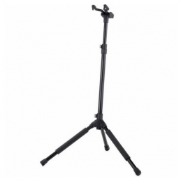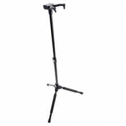 Folding stand for all guitars. Features a patented flexible hooking-in and clamping system which quickly and firmly grasps the guitar neck. Fits most instrument necks. Studs at support arms provide extra protection. Height adjustment with convenient locking levers. Anti-twist feature on the extension rod for extra safety. High quality non-marring rubber on the stand's neck grip and base helps to protect the instrument. Stable robust base.