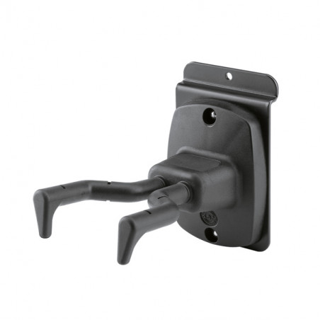 The patented guitar holder 16240 is now also available for Spacewall. The flexible hooking-in and clamping system quickly and firmly grasps the guitar neck when the guitar is put into place and the rubber covered support arms release automatically on removal.