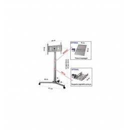Supporto da pavimento per TV, regolabile in altezza, con adattatore universale e passaggio dei cavi all'interno della struttura. Poggia su 3 gambe ripiegabili dotate di ruote con freno di sicurezza. Altezza massima misurata al centro dello schermo cm 200. Distanza massima orizzontale tra i fori di fissaggio: 70 cm. Distanza massima verticale tra i fori di fissaggio: 42,5 cm . Colore alluminio