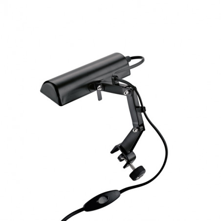 Classic music stand light with black light shade. Three-way tilt adjustment for precise placement. Two meter electrical cable with on-off switch and Euro-style plug. One tubular bulb included. Uses only tubular bulbs with a maximum rating of 25 watts. In-door use only.