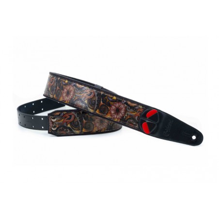Tracolla realizzata in modo artigianale con materiali ecologici ad alta tecnologia rispettosi dell’ambiente e priva di qualsiasi tessuto animale, caratterizzata da finiture curate in ogni dettaglio, rivestimento in tessuto decorato con motivi floreali, imbottitura in lattice ad alta densità (5 mm), sistema di regolazione RAS, porta plettri incorporato. Colore rosso, larghezza 6 cm, lunghezza regolabile da 100 cm a 145 cm, ultra leggera. Indicata per chitarra e basso