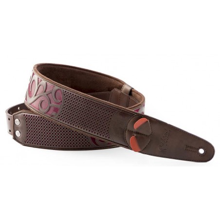 Tracolla realizzata in modo artigianale con materiali ecologici ad alta tecnologia rispettosi dell’ambiente e priva di qualsiasi tessuto animale, finiture curate in ogni dettaglio, caratterizzata da una fantasia ricordante antiche incisioni , imbottitura in lattice ad alta densita (5 mm), sistema di regolazione RAS, porta plettri incorporato. Colore beige, larghezza 6 cm, lunghezza regolabile da 95 cm a 143 cm, ultra leggera. Indicata per chitarra e basso.